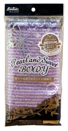 女性のために使い易さを重視した長さ90㎝のボディタオル。 従来のボディタオルに較べて泡がたくさんできるように織り込んだ生地と淡く優しいカラーが特長です。